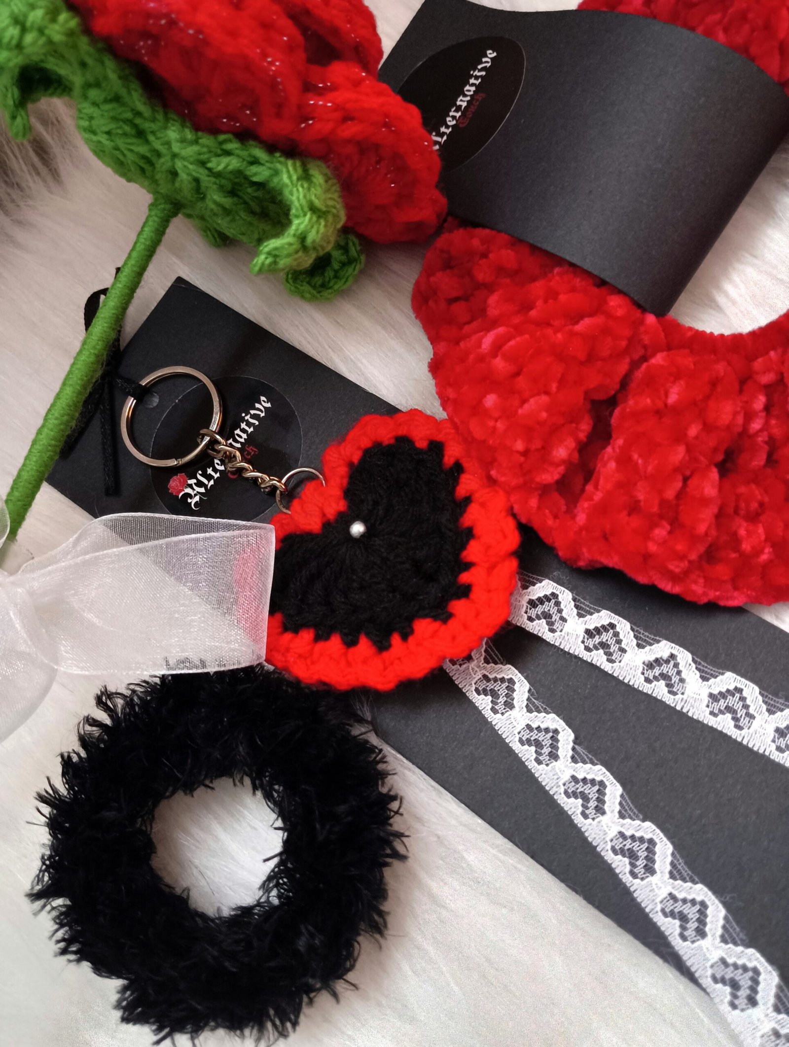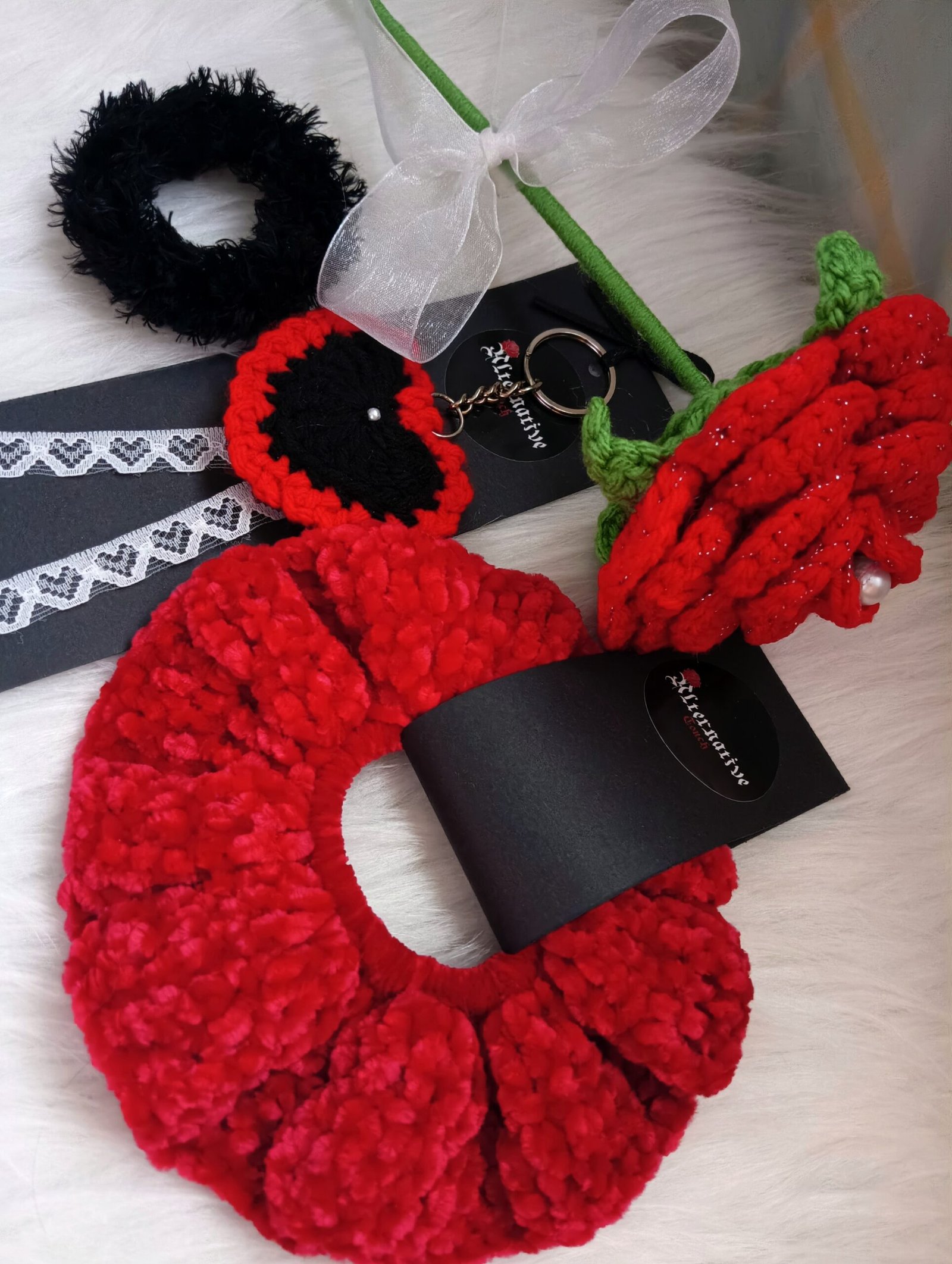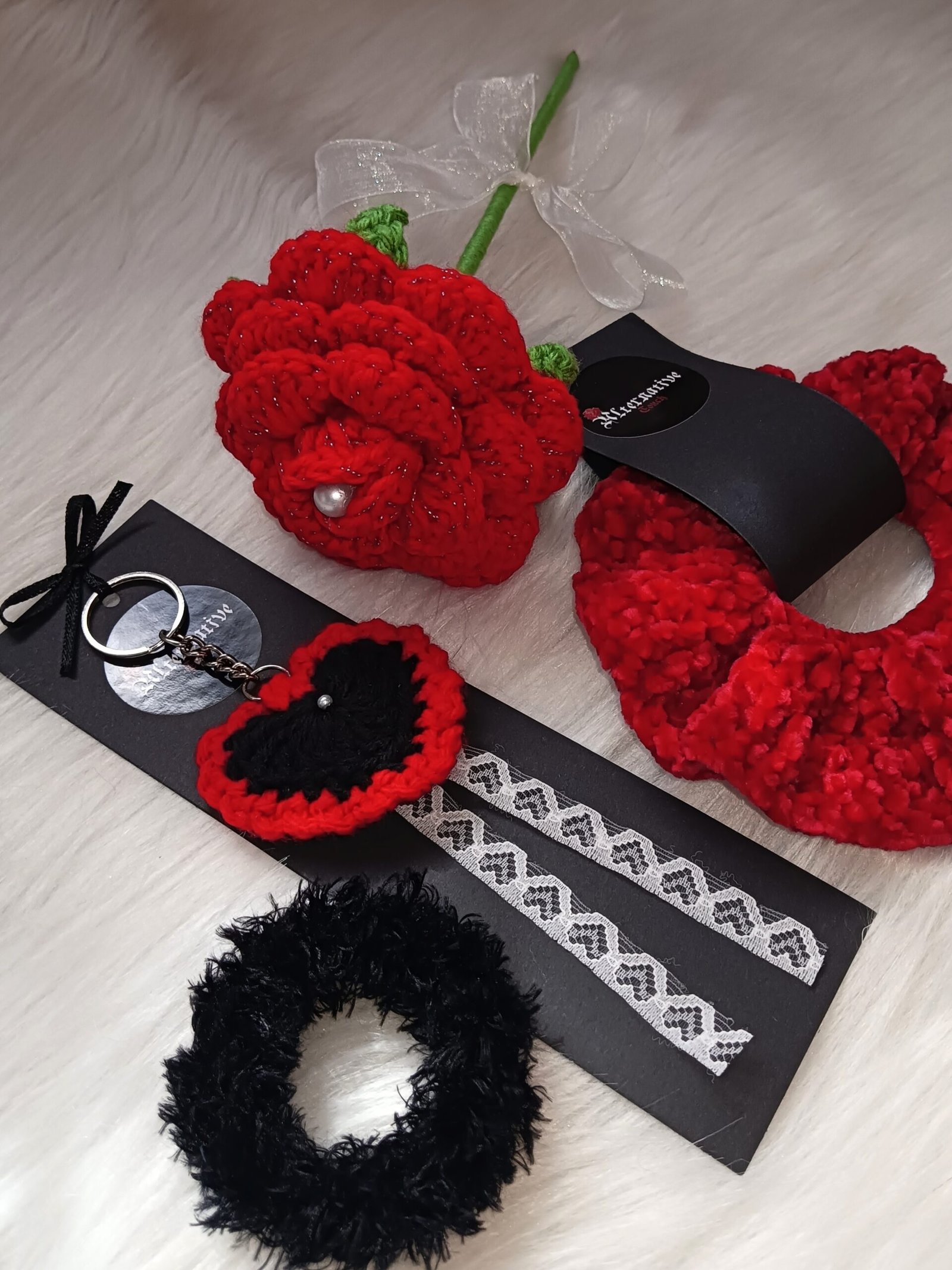 A beautiful red rose – crafted to shine, just like your love. A velvet scrunchie – soft to the touch. A lacy heart keychain – carrying a piece of you, everyday. A furry elastic tie – delicate, with an edge.