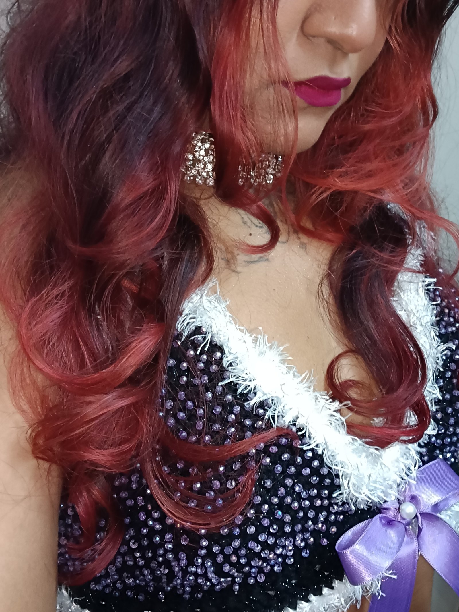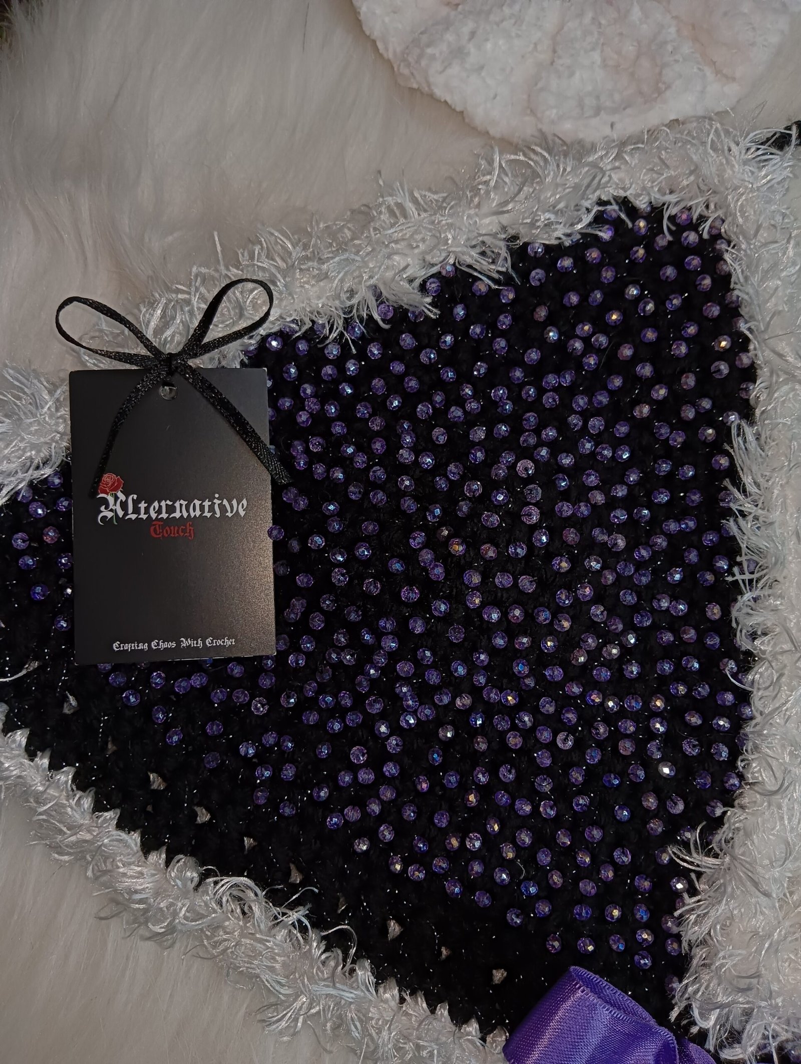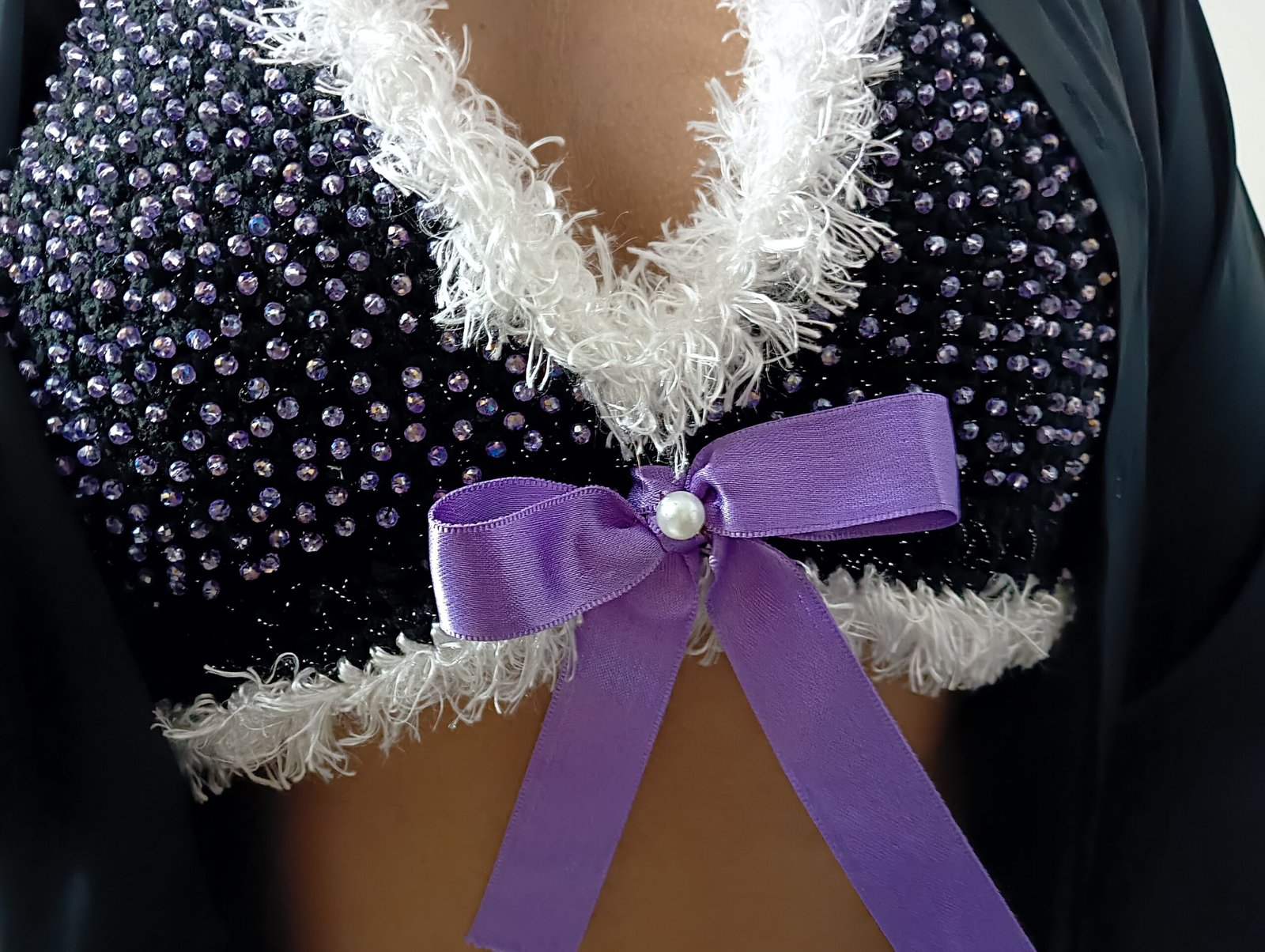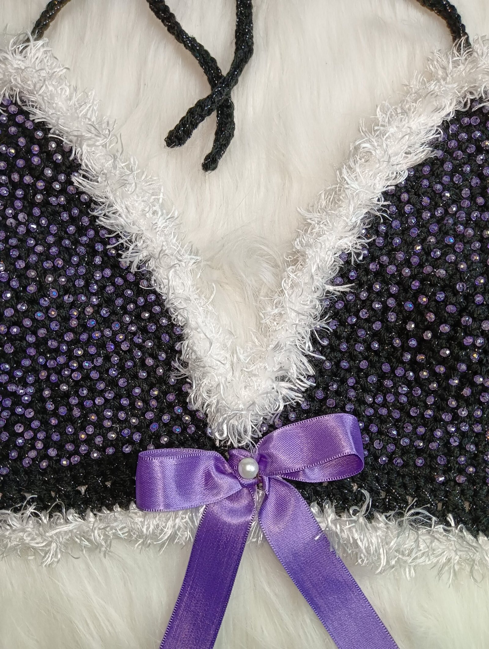 Obsidian Bloom Bralette is crafted on a deep black acrylic base, adorned with hand-stitched purple glass beads that catch the light with every move. Finished with a faux fur edge, a purple bow at the center and a white pearl accent. This piece is both striking and alluring. Adjustable tie straps make it fit like it was made for you.