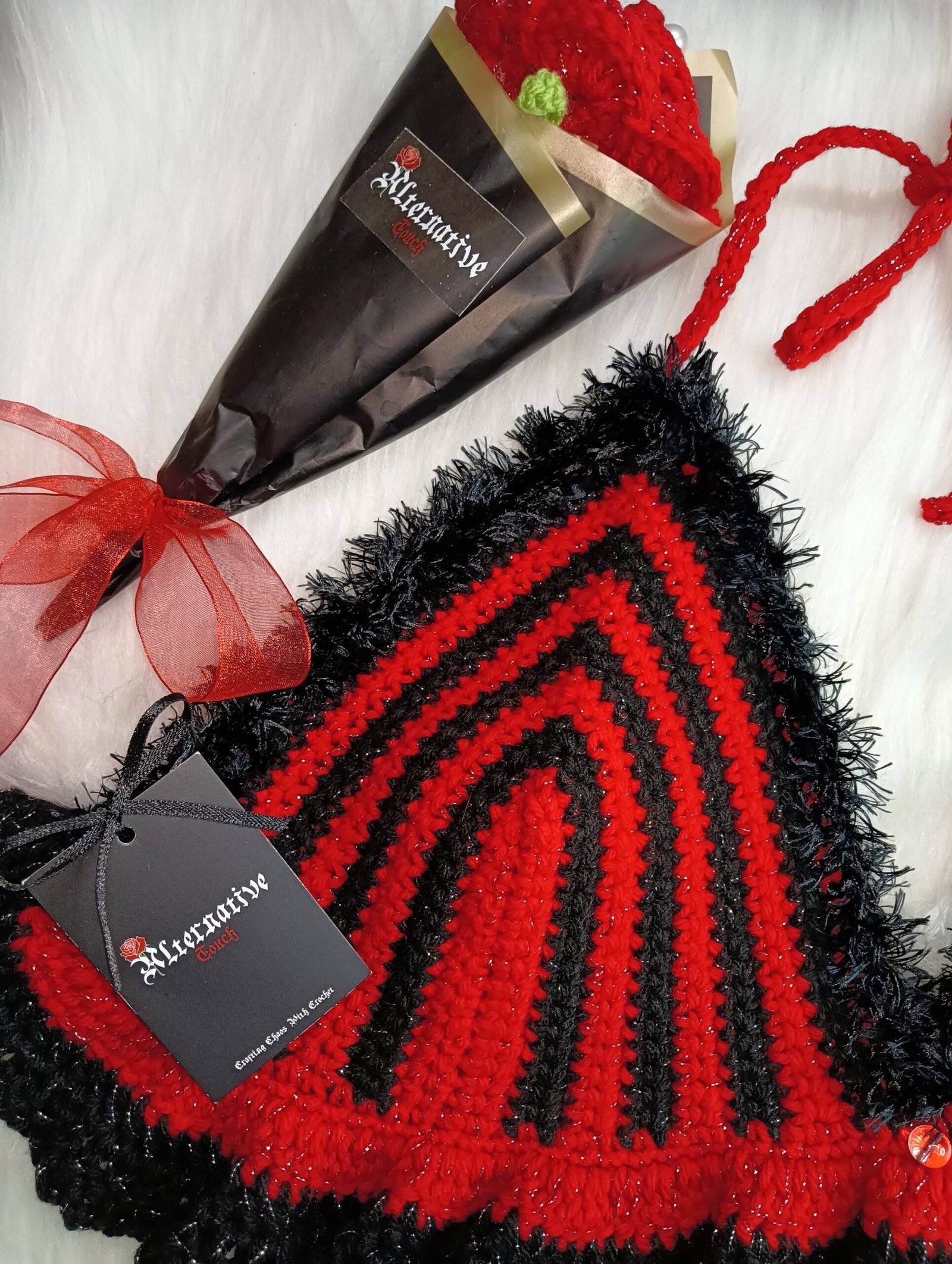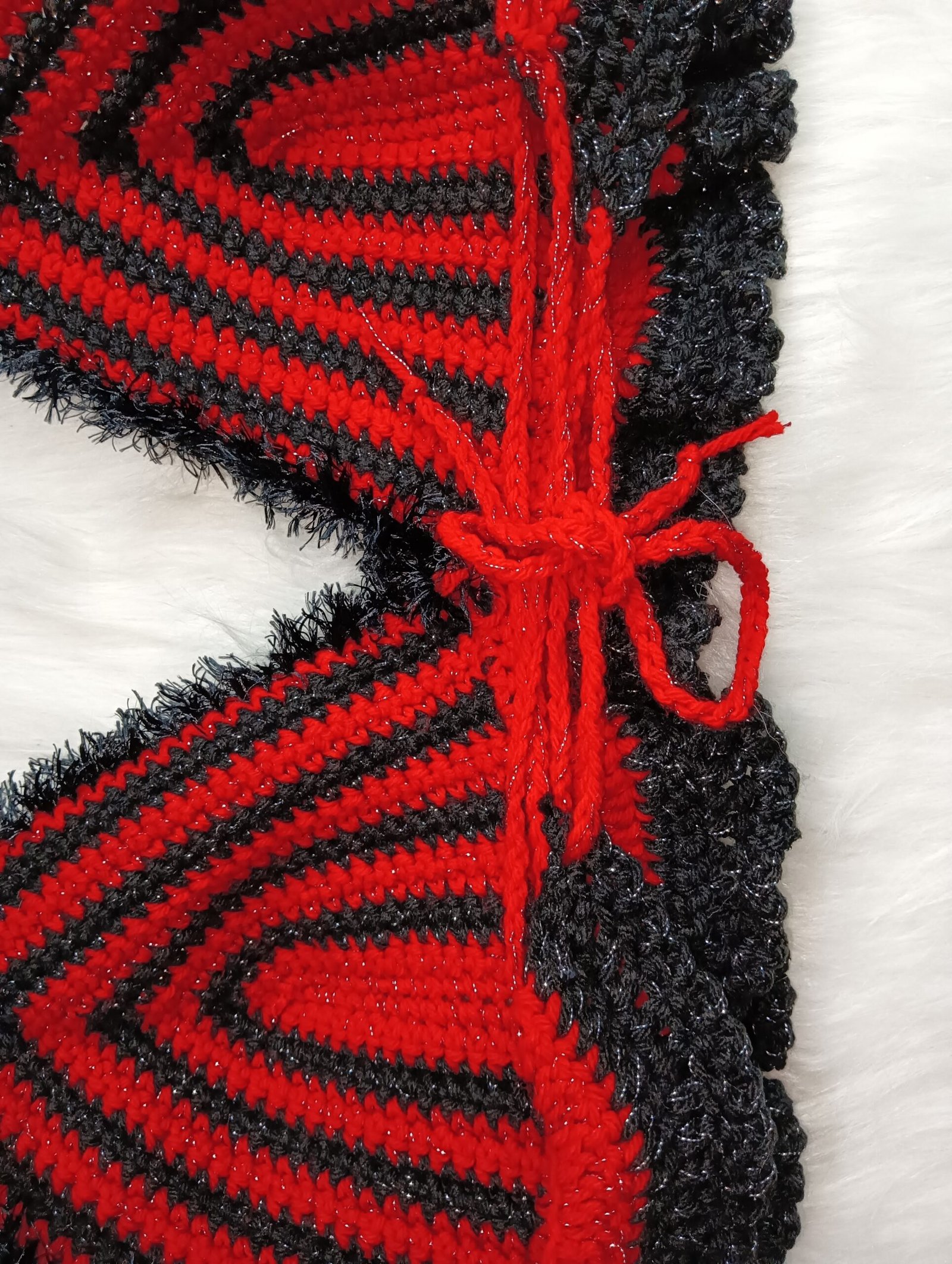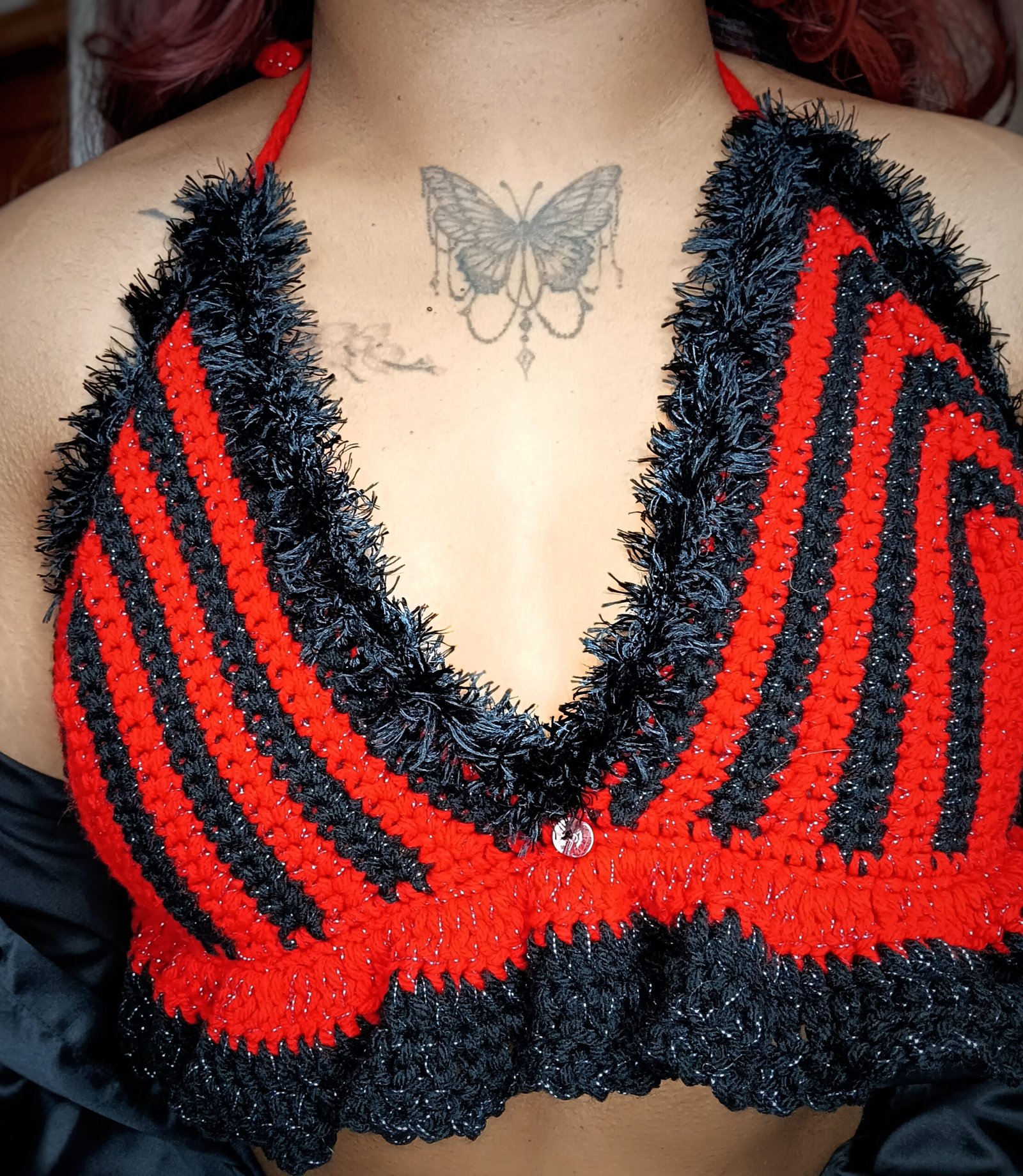 Scarlet Bralette is a fierce crochet piece handcrafted from deep black and red acrylic yarn, laced with a hint of shimmer and a delicate bead detail in the center. Finished with faux fur edges and adjustable tie straps — this piece is as bold as it is irresistible.